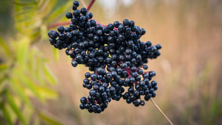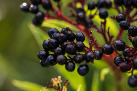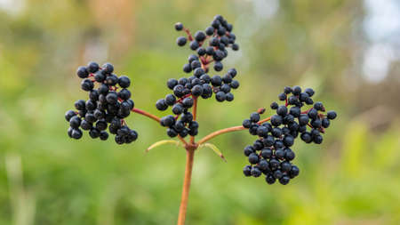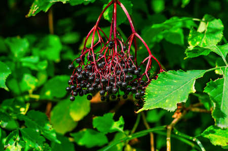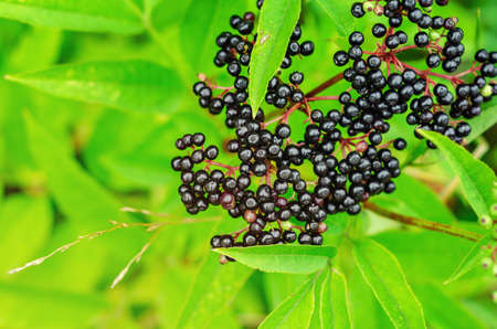 Black berries of elderberry in forest in nature. Medicinal plants, cold treatment, covid