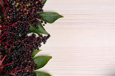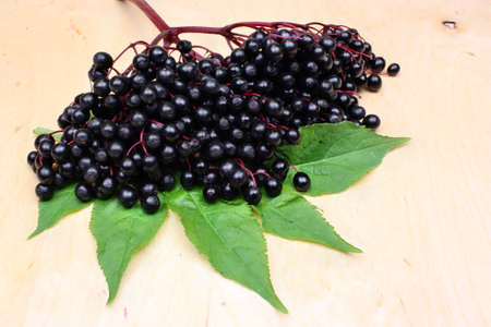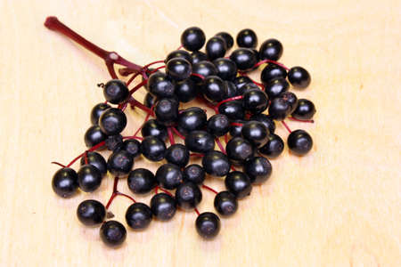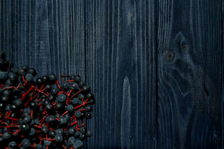 European black elderberry on a wooden background. (Sambucus nigra). Fruit black elderberry