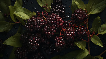 Elderberry background with ripe berries and fresh leaves. Alternative medicine and lifestyle, macro
