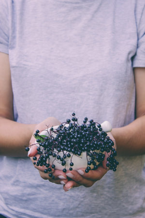 Fresh Elderberry fruits. Ripe Elderberry in hand