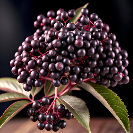 Vibrant and fresh ripe elderberry on dark purple background, high quality isolated image