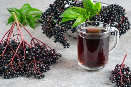Ripe elderberry with green leaves and drink in a glass on a gray textured background.
