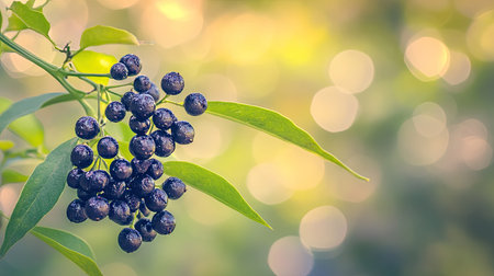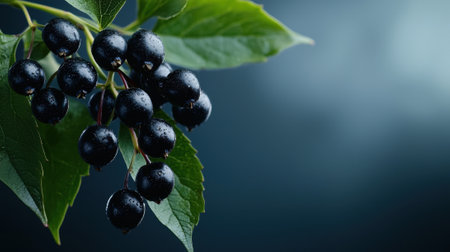 A close up of a leafy plant with a cluster of berries on it. The berries are dark and shiny, and the leaf is green and full. Concept of natural beauty and tranquility