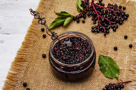 Elderberry jam. Ripe berries, sweet and healthy dessert. Alternative medicine and lifestyle. White wooden boards background, close up