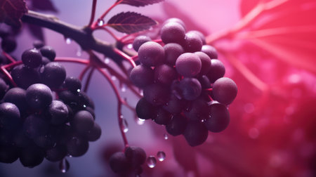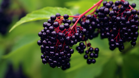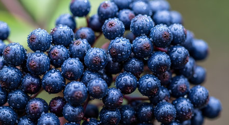 A close-up shot captures the vibrant beauty of elderberries adorned with glistening water droplets, embodying freshness and natural wellness.