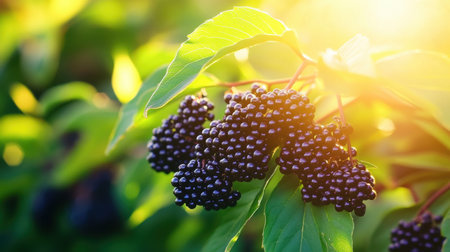Sunlight illuminates clusters of ripening blackberries nestled among vibrant green leaves in a summer garden, showcasing nature's bounty at its finest