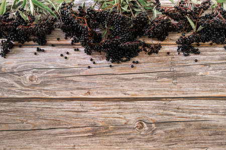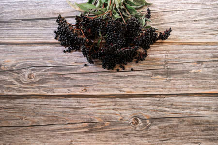 Bunch of fresh elderberry on old rustic wooden background, healthy food, nutrition and alternative medicine, copy space for text