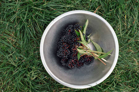 Raw ripe elderberry in a bowl standing on a green grass, top down view. Clusters fruit black elderberry. Sambucus nigra