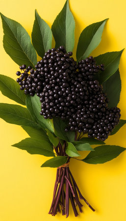 Freshly picked elderberry bunch on vibrant yellow background, dark purple berries, close up.