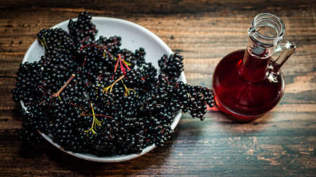 Elderberry in a plate on a wooden table, elderberry herb tincture in a bottle. Berry medicine.