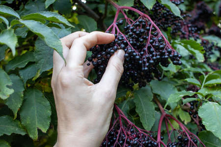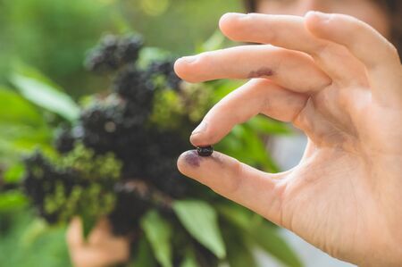 Woman picking elderberries in the garden. Female hand holds fruit black elder berry outdoors in nature. Summer, autumn harvesting season