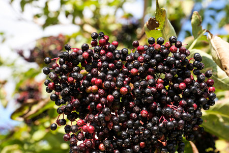 Bunches of black elderberry on a bush with green leaves against a blue sky. The berries of the black elderberry (Sambucus nigra) are depicted with green leaves.
