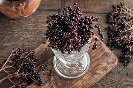 European black elderberry on a wooden background. (Sambucus nigra). Fruit black elderberry