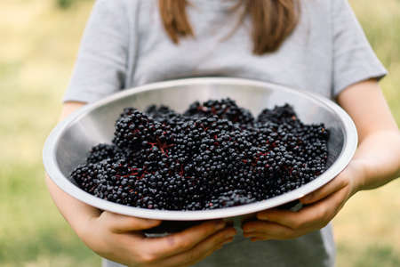Girl holds in hands clusters fruit black elderberry. Sambucus nigra. Black elder. European black elderberry background