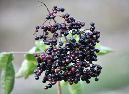 Elderberry. View of a bunch of black wild elderberries over green leaves. Autumn forest, soft focus, medicinal plant