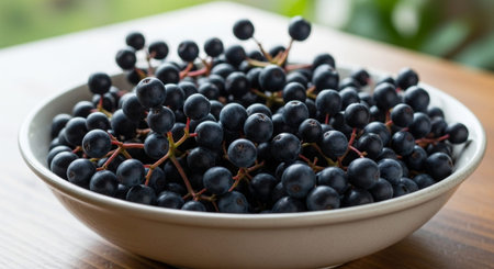 Elderberry in a ceramic bowl, on wooden desk. Healing berries of ripe black elderberry.