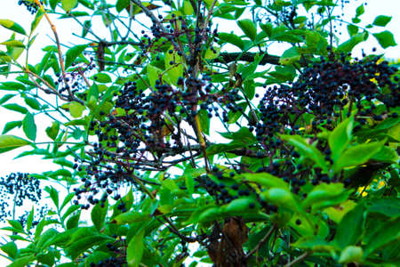 Clusters fruit black elderberry in garden in sun light (Sambucus nigra). Common names: elder, black elder, European elder, European elderberry and European black elderberry.