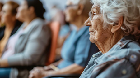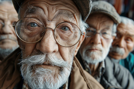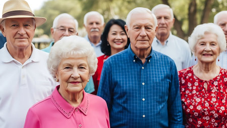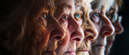 Row of diverse senior citizens close-up ai generated portrait image. Aged faces photography. Elderly friends with distinct expressions closeup picture photorealistic. Life stories concept photo