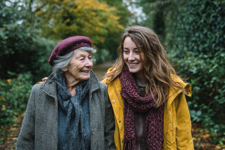 Elderly woman and young woman share a joyful moment while walking on a leafy path, surrounded by trees, highlighting their bond and warmth in a serene environment