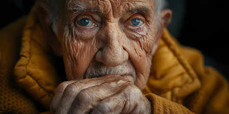This powerful close-up portrait captures the essence of an elderly woman with striking blue eyes, showcasing her rich facial textures and deep emotions.
