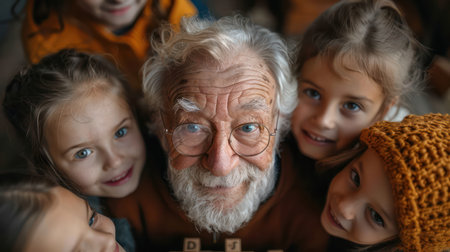 A elderly with glasses and a beard is smiling at a group of children. The children are all smiling back at him