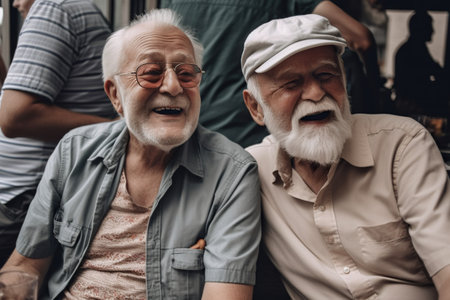 Portrait of two senior men sitting in cafe and laughing. Generative AI