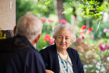 Senior man and woman talking on terrace with beautiful floral garden in background