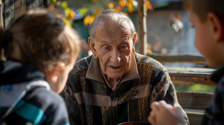 An elderly man sharing stories with young children about his life in a post-war era