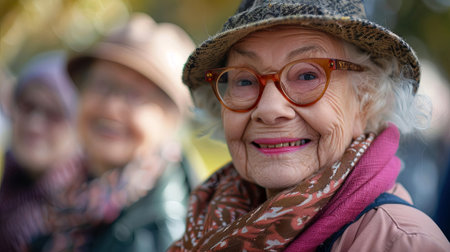 A joyful elderly woman with vibrant glasses and a patterned scarf embraces the warmth of autumn. Her smile radiates wisdom and happiness against a soft-focus backdrop. Generated A.I.