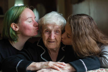 Two girls granddaughter kissing her grandmother.