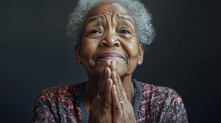 A woman with gray hair is praying. She is smiling and looking at the camera. Concept of peace and serenity