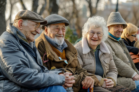 Elderly individuals are seated on a park bench, engaging in conversation, sharing stories, and laughing together, Elderly individuals sharing stories and laughter on a bench