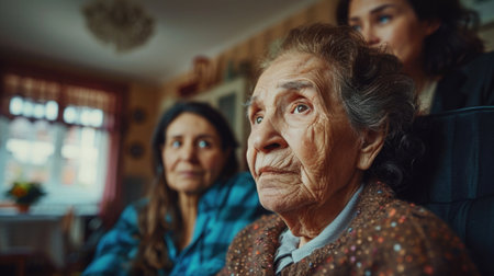 Elderly woman with a caregiver in a home setting, learning to use assistive devices for daily activities, showcasing adaptation strategies.