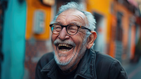 An elderly man with glasses laughing contagiously on a colorful urban street, radiating warmth and happiness. World Laughter Day