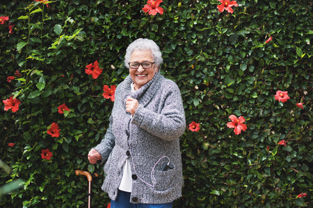 Portrait of mature gray haired elderly woman outdoor