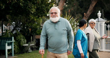 Happy, outdoor and portrait of senior man with smile for fresh air, wellness and relaxing in garden. Retirement, nursing home and elderly person in nature for peace, health and assisted living