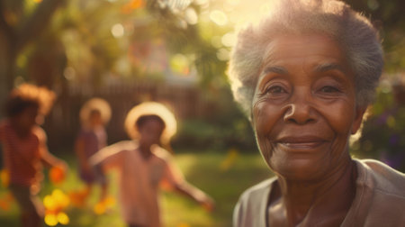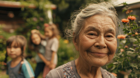 The close up picture of the grandmother living with the family in garden background, the picture of the family that has been filled with happiness, enjoyment and love also surrounded by nature. AIG43.