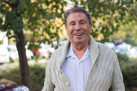 Portrait of happy senior man smiling, in the public park, outdoors.. Old man relaxing outdoors and looking at camera. Portrait of elderly man enjoying retirement