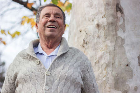 Portrait of happy senior man smiling, in the public park, outdoors.. Old man relaxing outdoors and looking away. Portrait of elderly man enjoying retirement