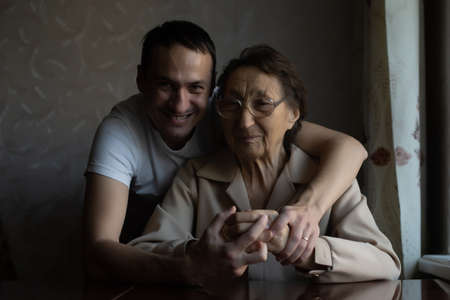 a very old woman and an adult grandson
