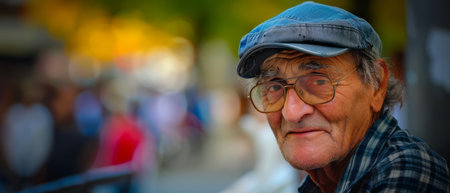 Joyful elderly man wearing glasses and a cap, smiling warmly among friends in an outdoor setting, symbolizing community, friendship, and positive aging.