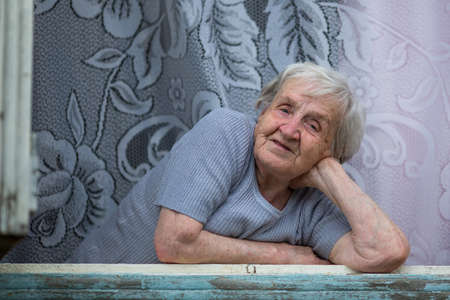 An elderly woman in his house looks out the window longingly. Old lady retired. Black and white photo.