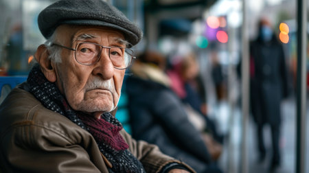 Aging Society Old man waiting at a bus stop lost in thought blur background AI generated
