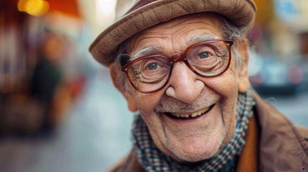 An elderly man with glasses laughing contagiously on a colorful urban street, radiating warmth and happiness. World Laughter Day