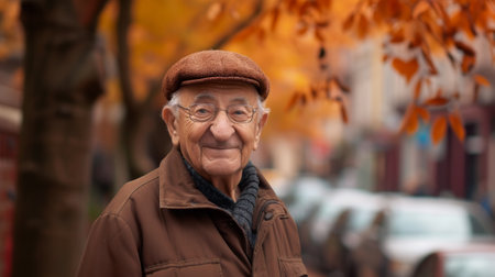 An old man dressed in a brown jacket and hat poses for a portrait.