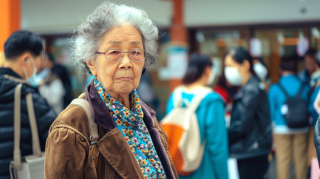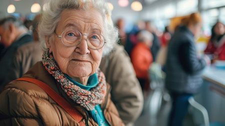 Senior Caucasian woman at a polling station. Elderly female Voter amidst a crowd at election center. Concept of elections, voter engagement, senior involvement, electoral decision making. Copy space