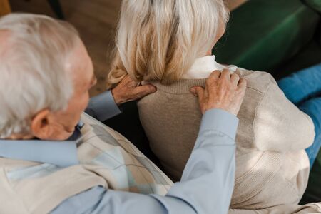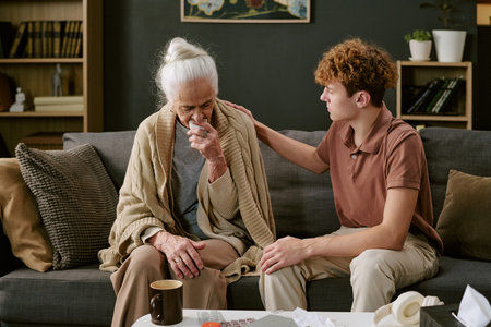Senior woman sitting on sofa holding tissue appearing emotional, while teenage boy sitting beside her comforting by gently placing hand on her shoulder
