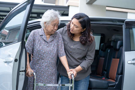 Help and support asian senior or elderly old lady woman patient walk with walker prepare get to her car, healthy strong medical concept.