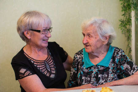 Senior support concept. Elderly gray-haired caucasian lady being supported by a nurse. High quality photo