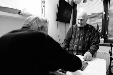 Two senior men playing chess while relaxing at nursing home in Turku, Finland